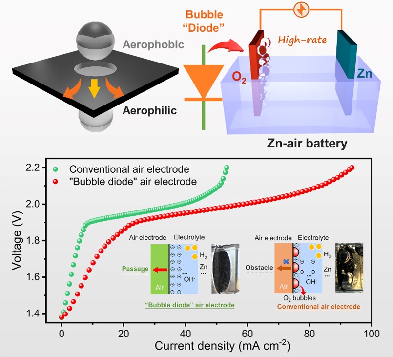 Boosting gaseous oxygen transport in a Zn-air battery for high-rate charging by a bubble diode-inspired air electrode