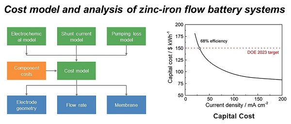 - Cost evaluation and sensitivity analysis of the alkaline zinc-iron flow battery system for large-scale energy storage applications- A cost model for a 0.1 MW/0.8 MWh alkaline zinc-iron flow battery system is presented, and a capital cost under the U.S. Department of Energy’s target cost of 150 $ per kWh is achieved. Besides, the effects of electrode geometry, operating conditions, and membrane types on the system cost are investigated. This work provides an integrated estimation for the zinc-iron flow battery system, demonstrating its tremendous potential for grid-level energy storage applications. - September 2021