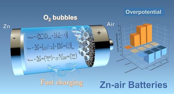 This paper presents a detailed mathematical model based on the bubble evolution for three types of bubble-induced overpotentials in Zn-air batteries during high-rate charging, including activation overpotential, ohmic overpotential, and concentration overpotential, which provides theoretical guidance for the application of this technology towards the "peak carbon dioxide emissions and carbon neutrality" goal, and is expected to provide some thinking on the universal bubble problem in electrochemical systems.