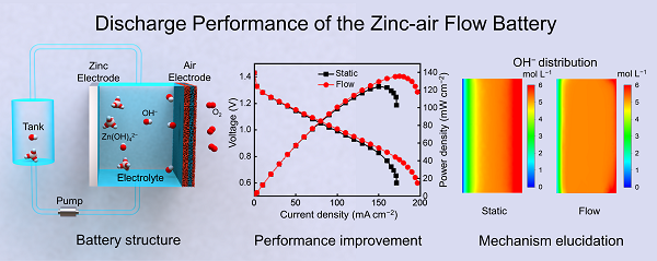 这个工作结合了数值模拟和实验,系统的研究了锌空气液流电池的放电过程,包括功率密度提升和放电容量提升的机理。此项工作可以为后续的锌空液流电池的设计及优化提供参考。