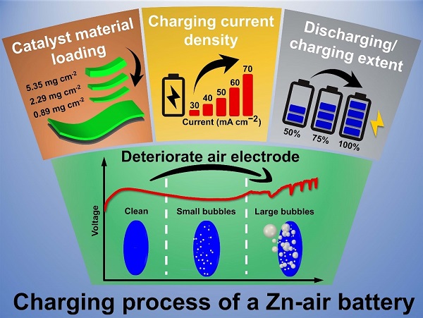 本工作通过原位表征手段对空气电极上的气体析出过程进行了深入研究。结果表明充电过程可分为三个典型阶段,且在较低电流密度和充放电深度下,空气电极可以始终保持“自清洁”状态从而免受气泡的影响。本工作提供了对空气电极充电行为的理解,有助于促进金属空气电池往实用化方向的发展。