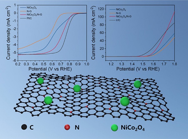 本工作利用水热法制备了NiCo2O4纳米颗粒修饰的氮掺杂石墨烯纳米片,其中采用新型非热弧等离子体法制备的氮掺杂石墨烯纳米片具有超高的比表面积和极小的尺寸。采用该催化剂制备的锌空气电池表现出优异的能量效率和循环稳定性。