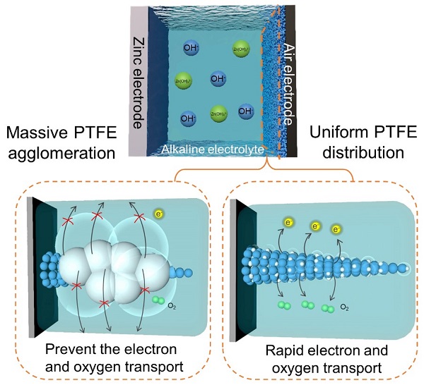 本工作提出了一种新型的锌空气电池一体化电极三相界面的处理方法,改善了传统一体化电极三相界面处理时粘结剂团聚的问题,有效地提升了电池的充放电性能以及循环稳定性