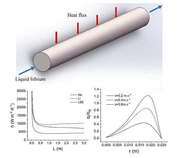 本工作通过数值模拟研究了液态金属锂在直管中的湍流流动,系统地研究了液态金属锂的进口流速,温度以及壁面热流密度对其传热性能的影响。这项工作揭示了高温液态金属锂在直管中的流动和传热特性,有助于促进液态金属锂在锂冷核反应堆中的应用。