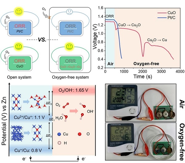 本工作以氧化铜为空气电极材料,创造性地解决了传统锌空气电池必须依赖于氧气运行的短板,开发了一种可以自由切换于空气以及厌氧条件下的新型锌空气电池,当其以锌空气模式运行时,可以表现出1.28V的电压,以锌铜模式运行时可以表现出1.13V以及0.79V的电压。此外,当该电池从厌氧环境切换到有氧环境后,正极材料还表现出了超快的自充电性能(~120s)。