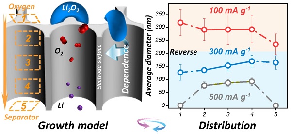 - Reacquainting the Sudden-Death and Reaction Routes of Li-O2 Batteries by Ex-Situ Observation of Li2O2 Distribution Inside a Highly Ordered Air Electrode- 该工作设计了一种具有高度有序阵列结构的碳包覆阳极氧化铝(C-AAO)空气电极,揭示了真实空气电极内部的Li2O2分布,而不仅局限于电极表面。基于此,进一步探究了锂氧气电池的传输机理:电压突降是电荷转移阻抗和浓差极化的耦合结果;提出了Li2O2的生长模型,并且解释了环形Li2O2对电极表面的依赖行为。该工作为理解Li-O2电池的工作机理和设计提供参考。 - 2022年9月