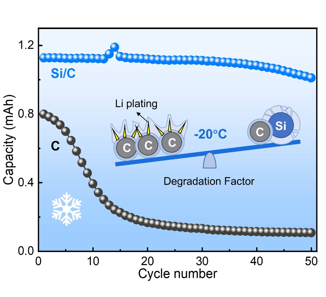 本篇工作意外发现了硅碳(Si/C)电池在低温(-20 ℃)下显著的性能提升,并探究了Si对阳极低温改性机理。这项工作为低温下锂离子电池稳定运行提供了一条有效的策略,更深入的机理研究将推动锂离子电池在太空、深海等极端温度的应用。