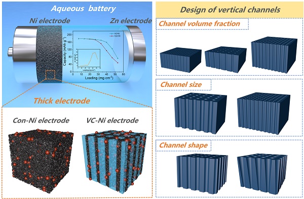 Design of Thick Electrodes with Vertical Channels for Aqueous Batteries: Experimental and Numerical Analysis