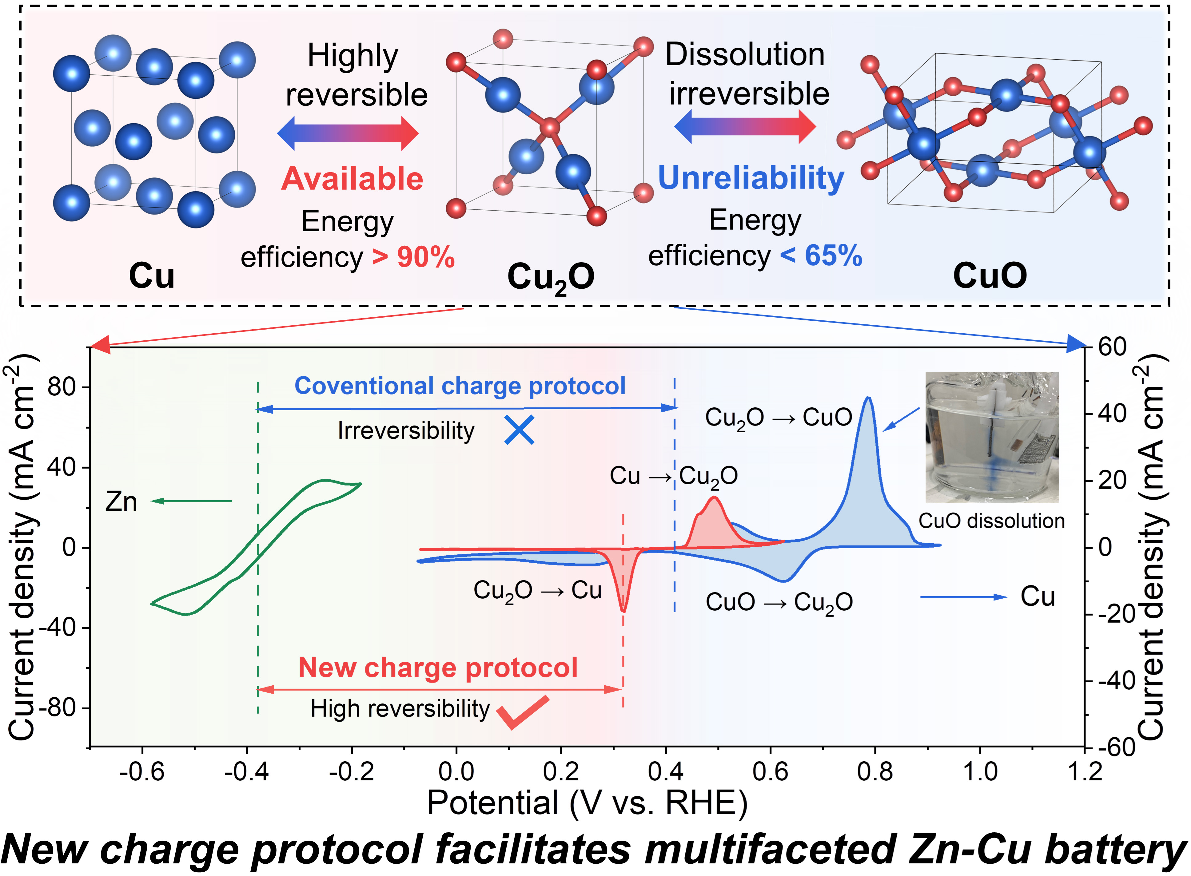 本工作系统研究了铜电极在碱性条件下充电过程中的溶解特性,揭示了其在高电压下的溶解机理。基于此,提出了一种基于部分溶解-沉积机理的电池充电协议,一方面通过前期自活化实现了高活性物质利用率,另一方面有效提升了电池的充放电循环稳定性(400周循环,无明显衰减)。该工作为未来低成本、高能量密度动力电池的研究提供了方向,有助于加速锌基电池体系商业化应用。