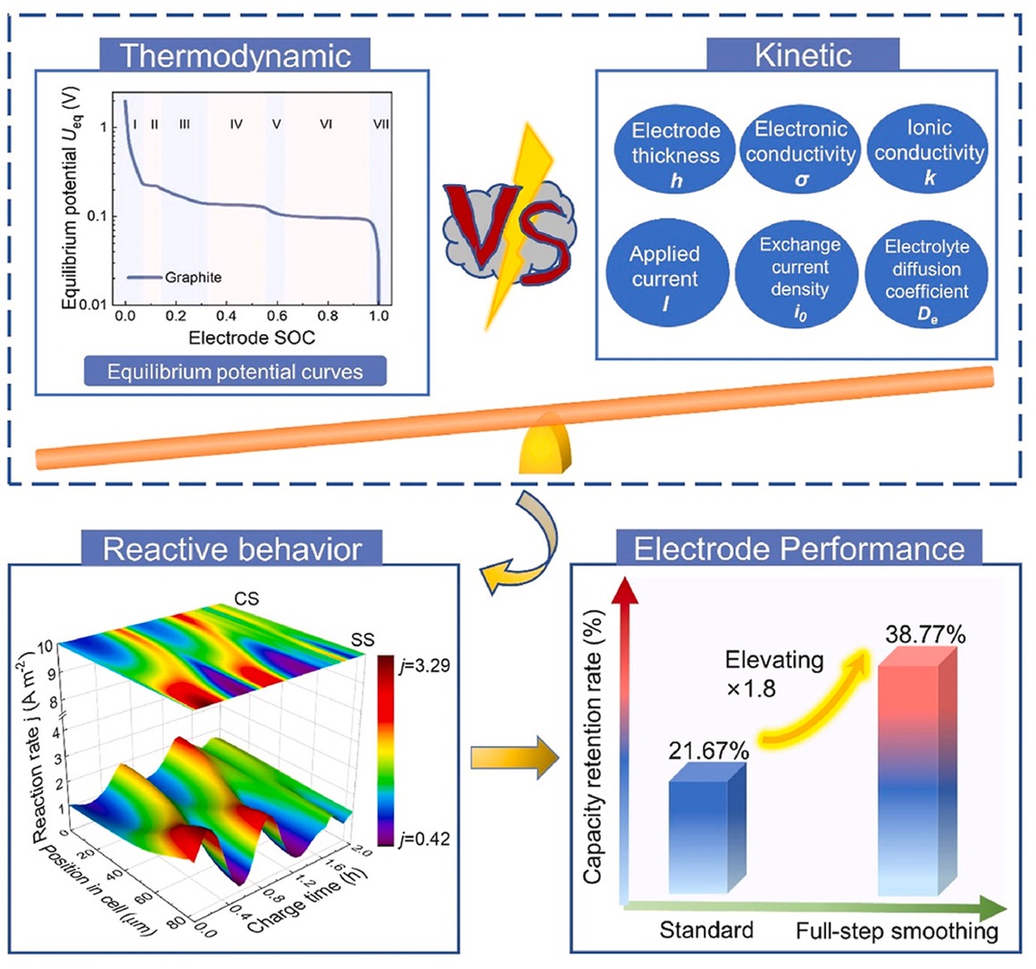 本篇工作探讨了石墨基电极在反应过程的热力学和动力学竞争关系,并可视化了电极反应过程,阐明了薄厚电极在高倍率下的受制因素。通过分别改善石墨电极的动力学性能和热力学性能进行对比,研究发现改善石墨的热力学性质,一样可以取得优异的效果,为电极的实际开发提供了一条全新的道路。