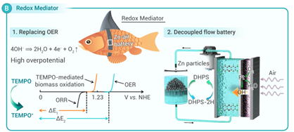本文对氧化还原介质(RMs)在锌空气电池(ZABs)中的创新应用进行了及时总结。主要涉及通过牺牲生物质分子来替代缓慢的氧析出反应(OER)以及在氧化还原流动电池中实现能量与功率的解耦。本文阐述了这一领域的基本原理、最新进展和未来发展方向,旨在推动锌空气电池在下一代储能设备中的持续稳健发展。