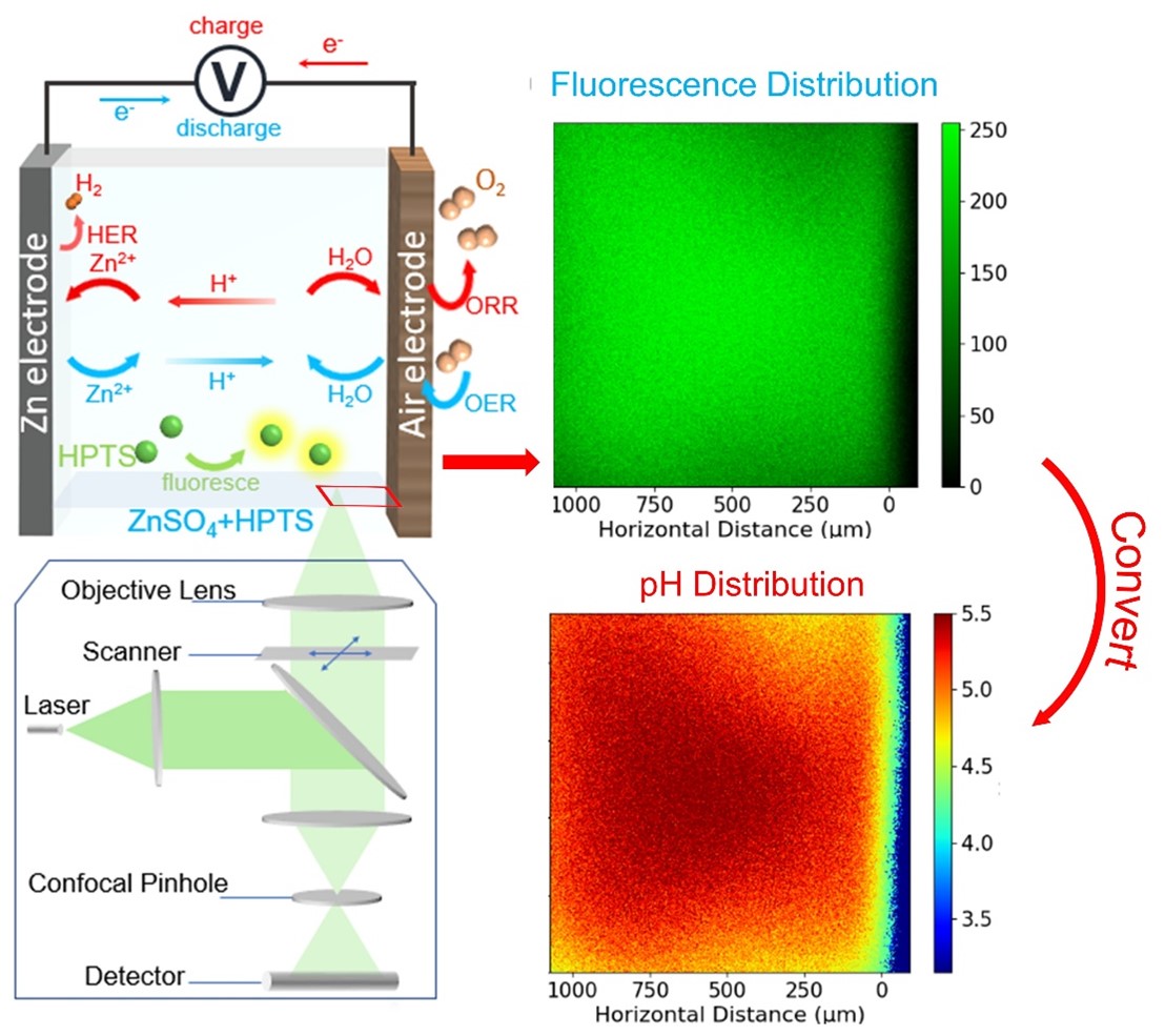 本工作通过创新性地引入激光扫描共聚焦显微镜,实现了对水系电池离子传输过程的原位可视化。以中性锌空气电池作为案例,使用pH敏感荧光探针,观察电池运行过程中与离子传输过程相关的实时动态pH变化。锌电极的腐蚀过程以及充放电过程中空气电极附近的离子传输特性都被可视化地呈现出来。这种方法为研究电池内部的离子传输过程开辟了一条新途径,为提高电池性能的设计提供了指导。