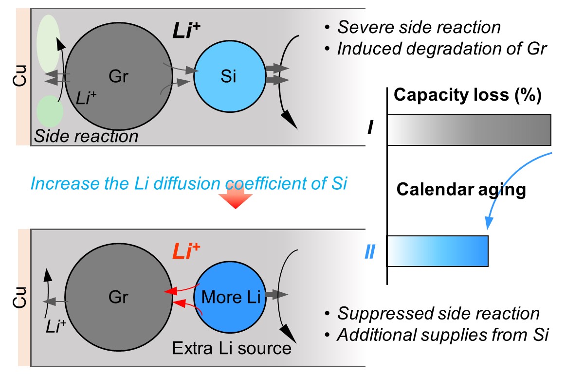 为了满足对高能量密度的需求,硅/石墨(Si/C)复合阳极的锂离子电池(LIBs)市场份额逐步扩大。与普遍认为的低自放电相反,我们证明了含有15 wt% Si的硅碳电池在室温下储存24小时后仅保留了77.7%的容量。我们定量分析了Si添加对日历老化的影响,结合跨尺度表征和多维模拟,揭示了锂串扰在存储过程中的关键作用。Si引起严重的副反应,导致显著的锂损失和电位跃升。为了平衡活性颗粒间电位,石墨被迫将Li+转移到Si,导致额外的容量损失。理论计算表明,通过改变串扰路径可以抑制自放电,例如通过提高活性材料的锂扩散系数(DLi+)。为了验证这种方法,合成了具有更高DLi+的Si@C材料,并且含有15 wt% Si@C的改进电池在储存24小时后保留了93.0%的容量。这项工作揭示了锂串扰对日历老化的潜在影响,为研究其他复合电极系统的降解机制提供了新的视角和指导。