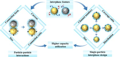界面问题是限制电池容量的因素之一。为探讨界面组分对容量的影响,将界面分为电子输运和离子输运两部分,定量分析两部分对容量的贡献。将硅粒子界面的4个电子输运区从25%内分布优化到完全分布,使容量从0.51 μAh提高到1.27 μAh。随着各电子通道覆盖率的增加,容量从1.27 μAh增加到2.43 μAh。将4个通道进一步细分为48个分散的导电通道,容量最大可达6.32 μAh。然而,过高的导电区域覆盖率导致容量下降。进一步,将模型扩展到粒子间相互作用,研究活性硅对死硅的活化作用。结果表明,颗粒间导电碳链接活化效果最好,连接比从1.4%进一步提高到4.2%,活化效果提高10%。本研究揭示了离子-电子耦合输运对容量的影响,对高性能锂离子电池电极材料界面设计具有指导意义。