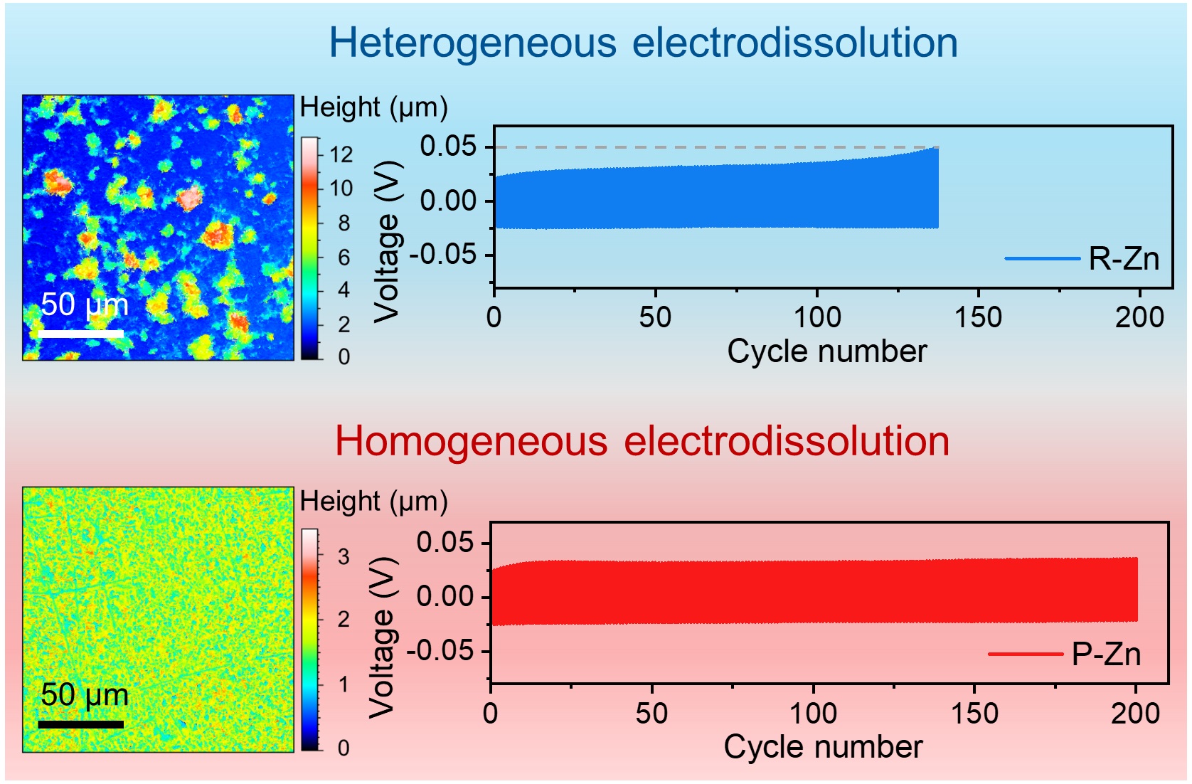 水系锌基电池锌电极在长时间循环过程中不可逆的电化学溶解和沉积行为导致了不可控的枝晶生长。不同于锂离子电池,水系锌基电池的起始运行工步是放电过程,即锌电极首先发生电溶解反应,而不是电沉积。然而,现有研究大多集中在锌的电沉积行为上,电溶解特性却被忽视。本工作全面揭示了锌电极的电溶解机理,为提升锌电极的可逆性提供了新思路。