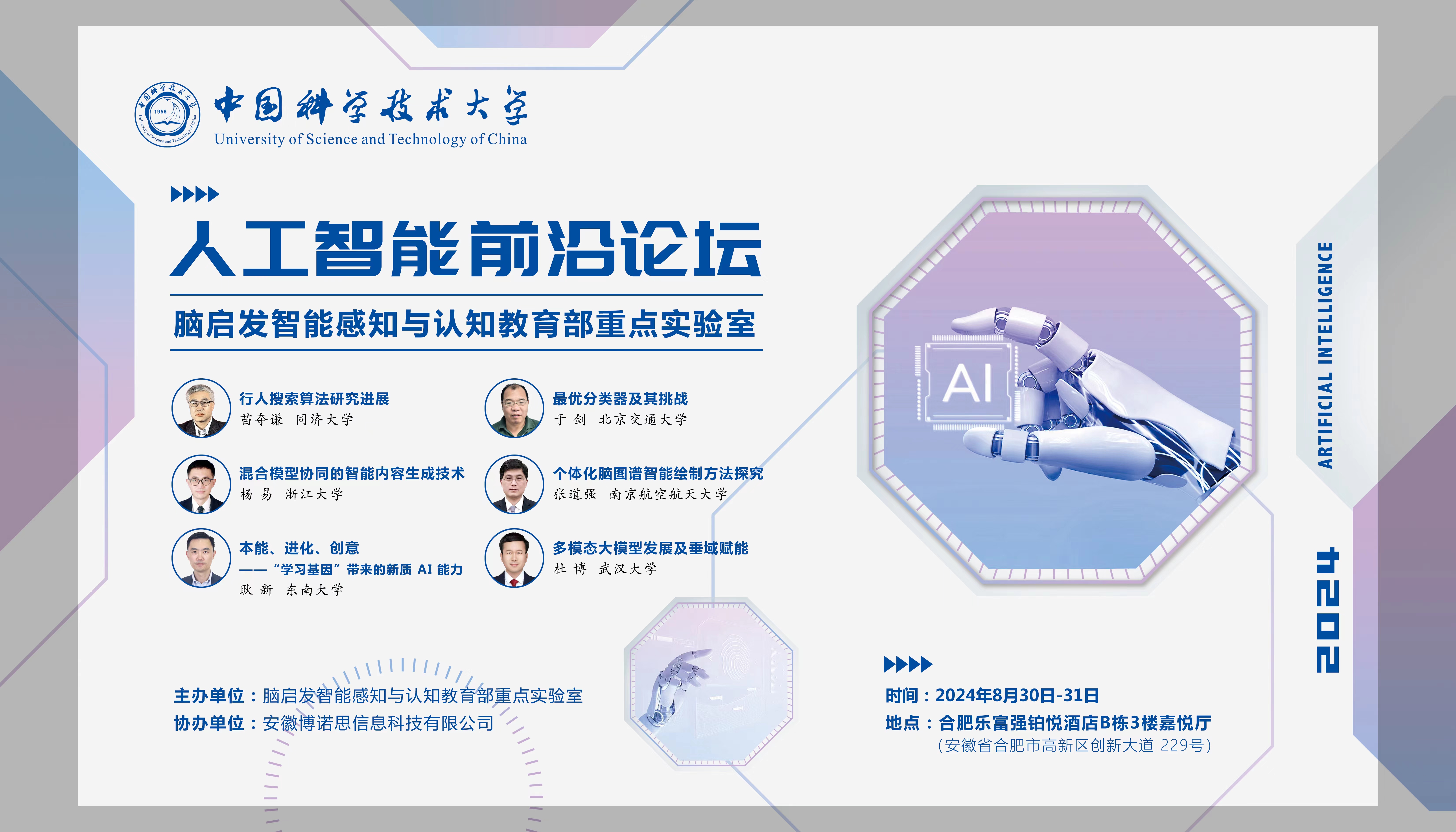 “脑启发智能感知与认知教育部重点实验室”人工智能前前沿论坛即将于8月30-31日在合肥召开。实验室邀请了一批国内人工智能相关方向的知名专家,诚挚邀您一起参会。