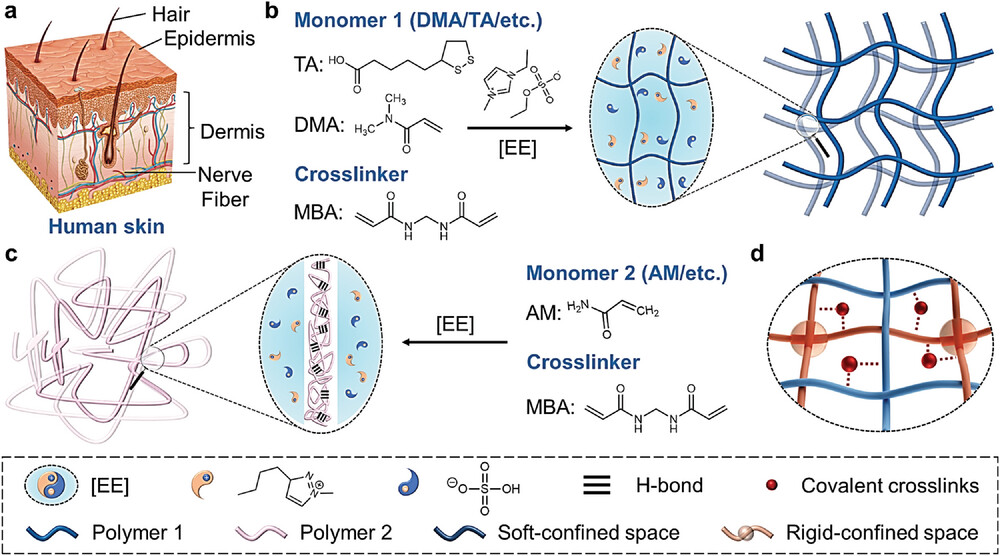 神经经纤维在人体皮肤表皮和真皮层的分布是不同的。在真皮中,神经纤维分布均匀,而在表皮中,神经纤维主要附着在其表面。受到神经纤维在表皮与真皮中差异性的分布结构的启发,他们选用对1-乙基-3-甲基咪唑硫酸乙酯([EE])离子液体具有不同结合能力的聚合物进行原位聚合,制备聚硫辛酸--丙烯酰胺(P(TA-co-AM)/[EE])和聚N, N’二甲基丙烯酰胺--丙烯酰胺(P(DMA-co-AM)/[EE])离子凝胶。