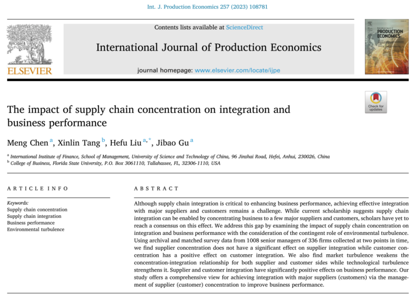 近日,本实验室研究团队在管理学知名国际期刊International Journal of Production Economics上发表了题为“The impact of supply chain concentration on integration and business performance”的学术论文(详见以下题录)。该论文的第一作者为优米娱乐app国际金融研究院陈猛副研究员,通讯作者为优米娱乐app管理学院刘和福教授。该期刊属于ABS 3星高质量学术期刊,也是SSCI一区期刊,其2022年影响因子为11.251