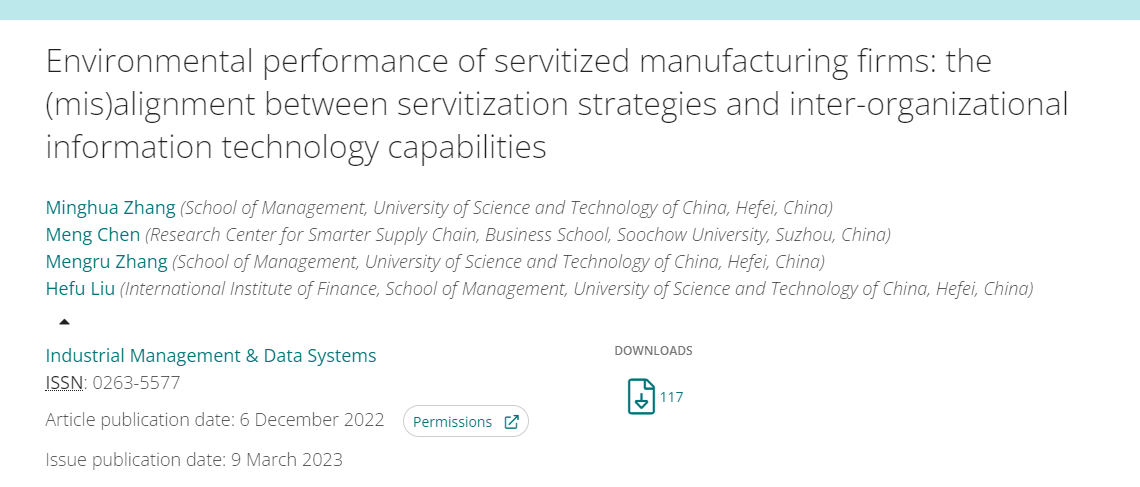 近日,本实验室研究团队在管理学知名国际期刊Industrial Management and Data Systems上发表了题为“Environmental performance of servitized manufacturing firms: the (mis)alignment between servitization strategies and inter-organizational information technology capabilities”的学术论文(详见以下题录)。该论文的第一作者为优米娱乐app管理学院硕士研究生张明华,通讯作者为优米娱乐app国际金融院陈猛副研究员。该期刊属于ABS 2星高质量学术期刊,也是SSCI一区期刊,其2022年影响因子为4.803