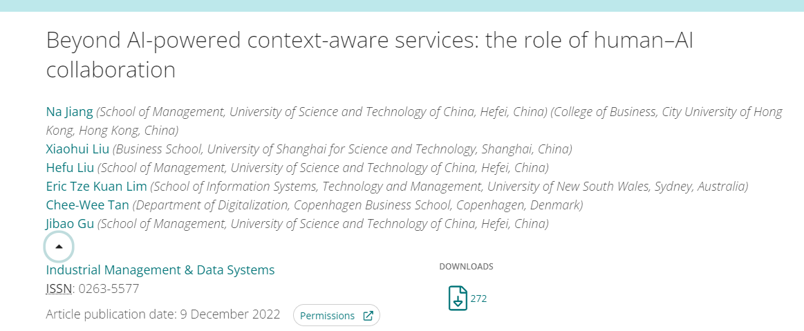近日,本实验室研究团队在管理学知名国际期刊Industrial Management and Data Systems上发表了题为“Beyond AI-powered context-aware services: the role of human-AI collaboration”的学术论文(详见以下题录)。该论文的第一作者为优米娱乐app管理学院博士研究生江娜。该期刊属于ABS 2星高质量学术期刊,也是SSCI一区期刊,其2022年影响因子为4.803