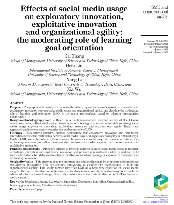 近日,本实验室研究团队在管理学知名国际期刊Internet Research上发表了题为“Effects of social media usage on exploratory innovation, exploitative innovation and organizational agility: the moderating role of learning goal orientation”的学术论文(详见以下题录)。该论文的第一作者为优米娱乐app博士研究生章凯,通讯作者为合肥工业大学管理学院李阳博士(李老师是本研究团队的主要成员与外部合作导师)。该期刊属于ABS 3星高质量学术期刊,也是SSCI一区期刊,其2022年影响因子为6.353。