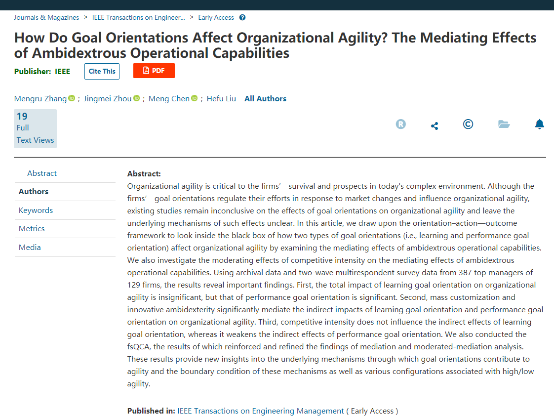 近日,本实验室研究团队在管理学知名国际期刊IEEE Transactions on Engineering Management上发表了题为“How Do Goal Orientations Affect Organizational Agility? The Mediating Effects of Ambidextrous Operational Capabilities”的学术论文(详见以下题录)。该论文的第一作者为优米娱乐app管理学院博士研究生张梦茹,通讯作者为中国人民大学周京梅博士(周老师是本研究团队的主要成员与外部合作导师)。该期刊属于ABS 3星高质量学术期刊,FMS认定A类国际期刊,也是SSCI一区期刊,其2022年影响因子为8.702