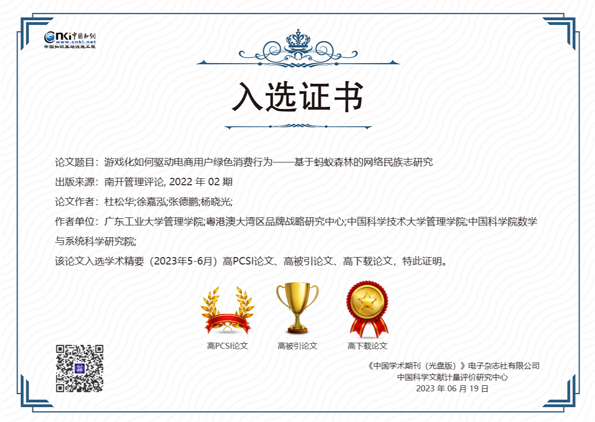 其中,本研究团队徐嘉泓博士生作为通讯作者于2022年发表在《南开管理评论》题为《游戏化如何驱动电商用户绿色消费行为——基于蚂蚁森林的网络民族志研究》的学术论文,被评选为“三高论文”(详见中国知网颁发的收录证书);即该研究论文同时入选所属学科前1%高被引论文、前1%高下载论文及前1%高PCSI论文。特别地,根据文献评价报告及知网数据库,截止2023年7月,该论文已被下载超过10000次,在“贸易经济”领域过去12年参与排名的超3万篇论文中排名前0.1%。