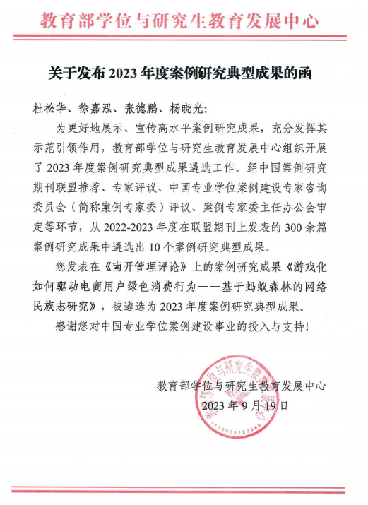 其中,以本实验室博士生徐嘉泓为通讯作者的案例研究成果《游戏化如何驱动电商用户绿色消费行为——基于蚂蚁森林的网络民族志研究》成功入选,获评2023年度中国十大“案例研究典型成果”!