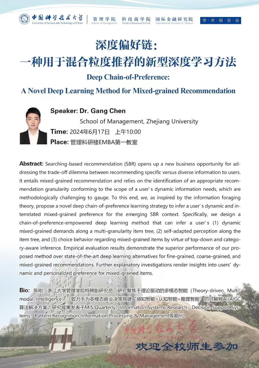 报告题目:“深度偏好链:一种用于混合粒度推荐的新型深度学习方法”
