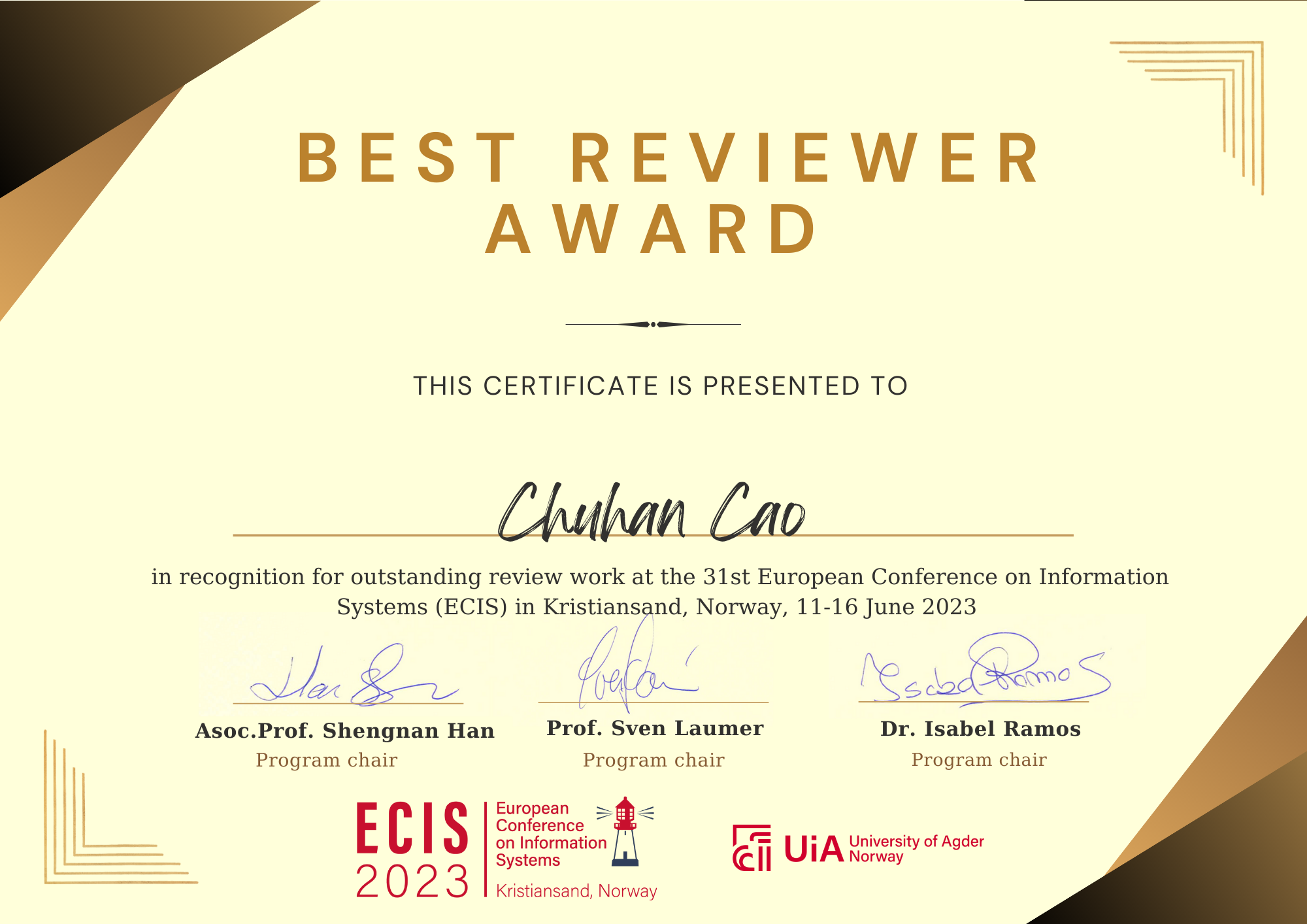 博士生曹楚涵获得2023ECIS最佳审稿人!